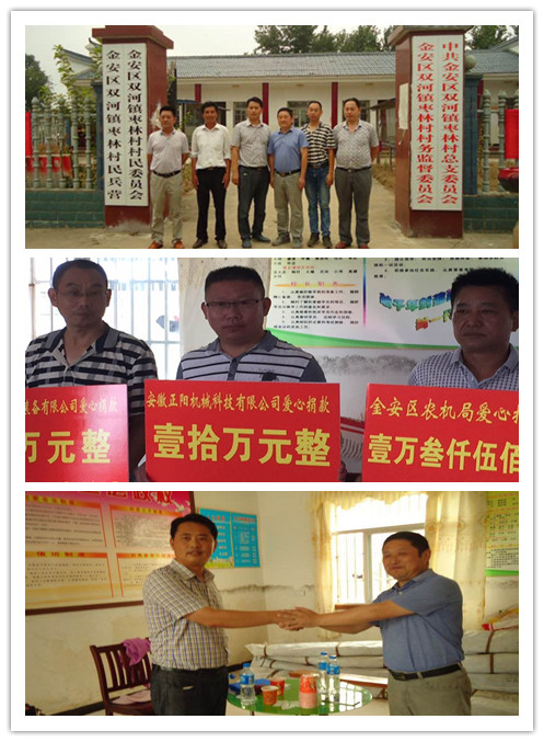 同時我公司針對今年長江中下游、江淮區(qū)域發(fā)生的嚴(yán)重的洪澇災(zāi)害勇于擔(dān)當(dāng),注重快速發(fā)展自身的同時更高度重視企業(yè)社會責(zé)任,本著以回報社會為己任;企業(yè)利潤來之于民、用之于民;義利兼顧的宗旨,安徽正陽機械科技有限公司總經(jīng)理張為法于2016年7月13日下午前往“正陽”糧食烘干機主銷區(qū)域安徽蕪湖、六安、湖北孝感等受災(zāi)嚴(yán)重地區(qū)捐贈現(xiàn)金數(shù)十萬元,幫助災(zāi)區(qū)人民萬眾一心共抗洪災(zāi),盡快恢復(fù)生產(chǎn),讓受災(zāi)群眾真實感受到黨和政府的溫暖、民營企業(yè)家的責(zé)任,公司以正能量品牌的形象和風(fēng)范履行了自身應(yīng)盡的社會責(zé)任。